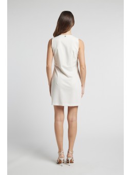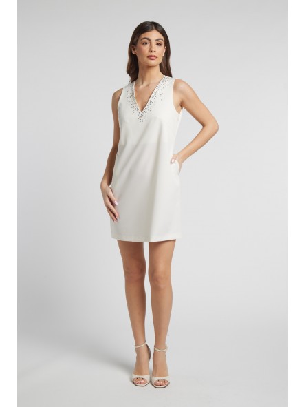 Abito Tubino Bianco con Strass: Un elegante mini abito smanicato con scollo a V, impreziosito da un raffinato decoro di strass argentati che illumina il décolleté. Il taglio dritto e pulito offre un look sofisticato per occasioni speciali