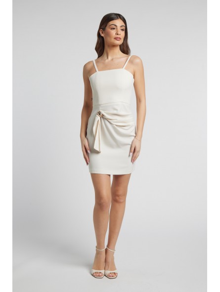 · Mini dress avorio con dettaglio a nodo: Un abito corto elegante color avorio, caratterizzato da spalline sottili e uno scollo squadrato. Il punto focale è il drappeggio in vita con un inserto metallico dorato che crea un sofisticato effetto a nodo sul fianco