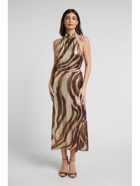 Abito Midi Satin Animalier: Un raffinato abito midi con stampa zebrata nei toni della terra e riflessi dorati. Caratterizzato da uno scollo all'americana (halter) e un'audace schiena scoperta con chiusura a fiocco. La cintura coordinata sottolinea il punto vita per una silhouette elegante e glamour