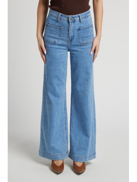 Jeans Wide Leg con Tasche a Toppa (Lavaggio Medio): Un modello a gamba larga molto attuale, ispirato allo stile anni '70. Si distingue per le ampie tasche quadrate applicate sul davanti e cuciture orizzontali decorative sui fianchi e sul retro