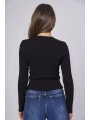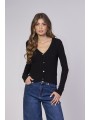 Questo cardigan nero a coste è un capo essenziale che unisce versatilità e stile. Con il suo scollo a V e la chiusura a bottoni, può essere indossato sia come maglia che come strato aggiuntivo, offrendo infinite possibilità di abbinamento. La vestibilità aderente sottolinea elegantemente la silhouette, mentre il tessuto a coste aggiunge una texture moderna al capo. Perfetto per un look casual abbinato a jeans a gamba larga come mostrato nell'immagine, o su un vestito per le serate più fresche. È il capo ideale per creare outfit stratificati e alla moda, confermandosi un classico del guardaroba versatile e comodo.