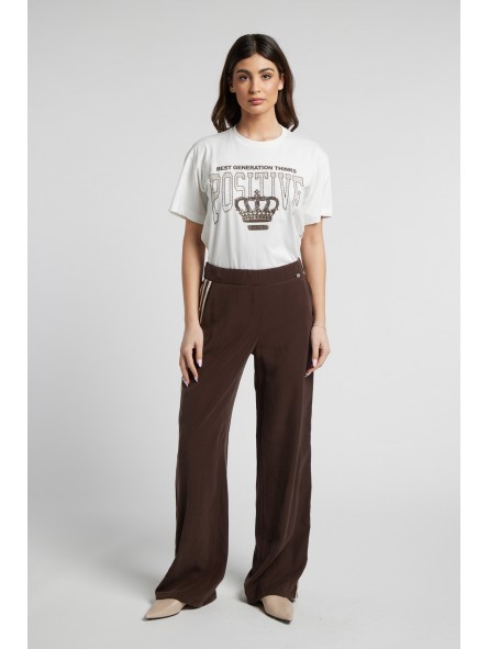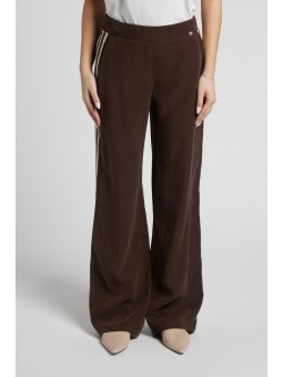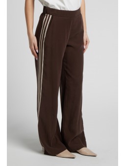 Pantalone Wide-Leg Brown con Bande: Unisce comfort e stile sporty-chic. Questo pantalone marrone a gamba larga presenta tre bande laterali a contrasto che slanciano la figura. La vita elasticizzata e il tessuto fluido lo rendono perfetto per un look quotidiano ricercato