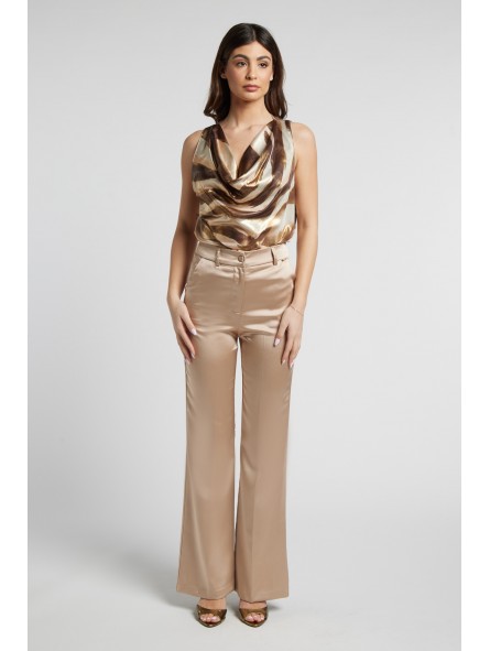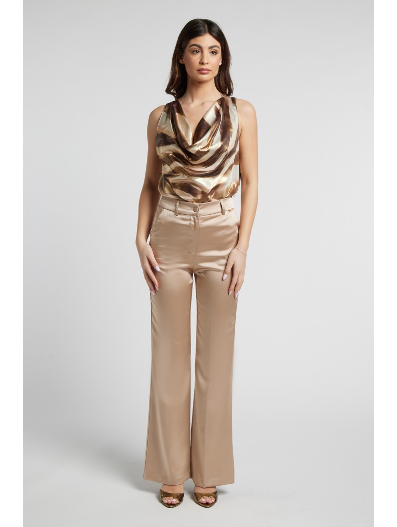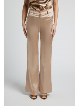 Pantaloni a Palazzo: Pantaloni a vita alta realizzati nello stesso tessuto satinato, caratterizzati da una gamba dritta e ampia con piega centrale stirata, che conferisce un aspetto formale e slanciato