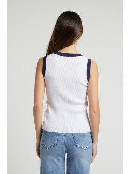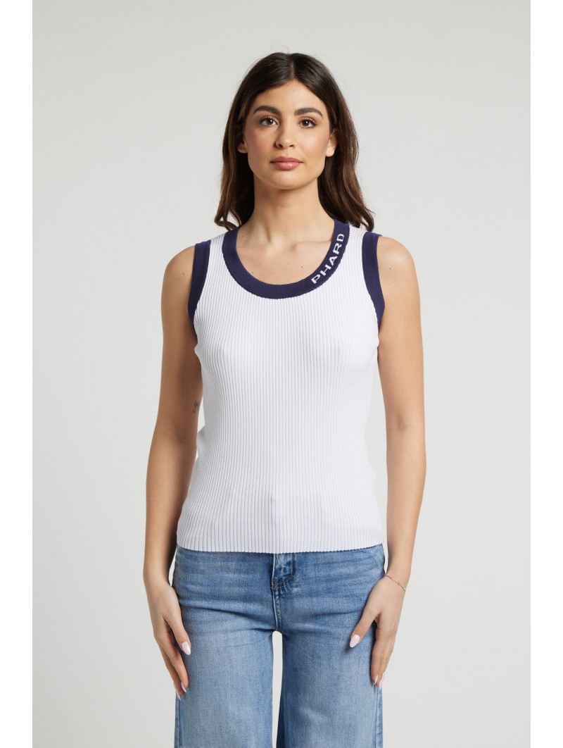 Canotta "Phard" a Contrasto: Top bianco in maglia a costine dallo stile sportivo e moderno. Presenta bordi blu navy su scollo e giromanica, con l'iconico logo "PHARD" ricamato lungo lo scollo. Ideale per un look fresco e dinamico.