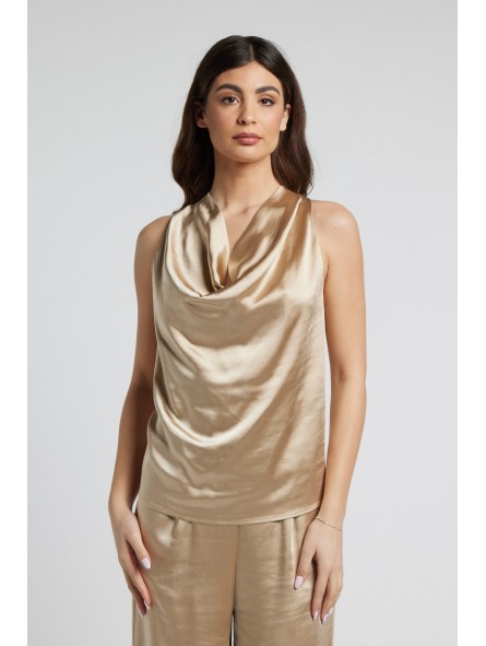 Top Satin a Collo Alto (095701): Un top senza maniche in tessuto satinato color champagne. Il design è caratterizzato da un voluminoso scollo a cappuccio sul davanti e uno stile halter sul retro. Presenta una chiusura posteriore con bottoncino e una piccola apertura a goccia, ideale per un look sofisticato da ufficio o da sera