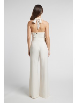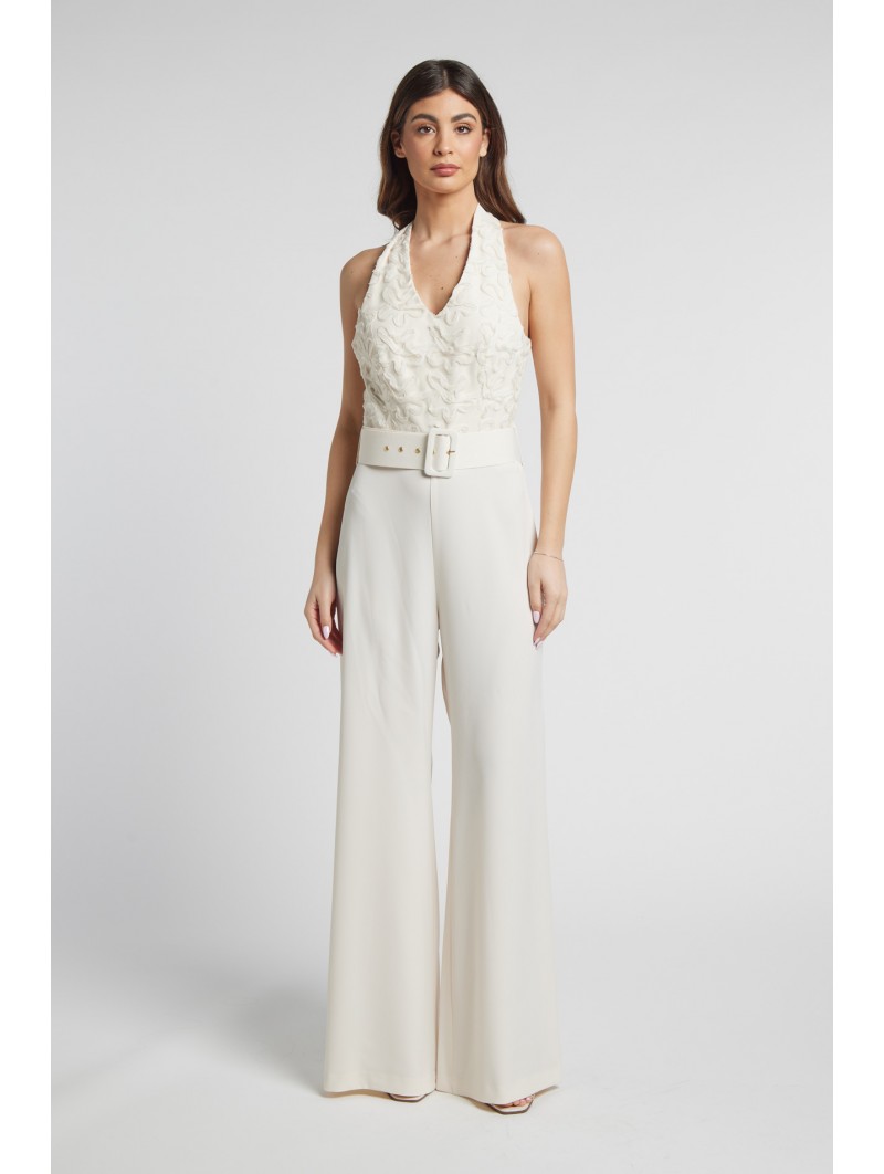 Tuta intera (Jumpsuit): Un modello con scollo a halter e corpetto lavorato a rilievo con motivi floreali o arabeschi. Presenta una cintura coordinata in vita con fibbia rivestita e pantaloni a gamba larga (palazzo) per una silhouette fluida
